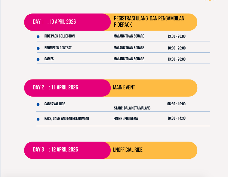 BROMPTON DAY OUT boleh dibilang sebagai Jamborenya pecinta sepeda BROMPTON dan telah berhasil diselenggarakan di berbagai kota di Indonesia. Untuk tahun 2026 BROMPTON DAY OUT yang ke-11 akan dilaksanakan di kota MALANG, yang dipercayakan kepada BROMPTON NGALAM SQUAD (BNS) sebagai pelaksananya.